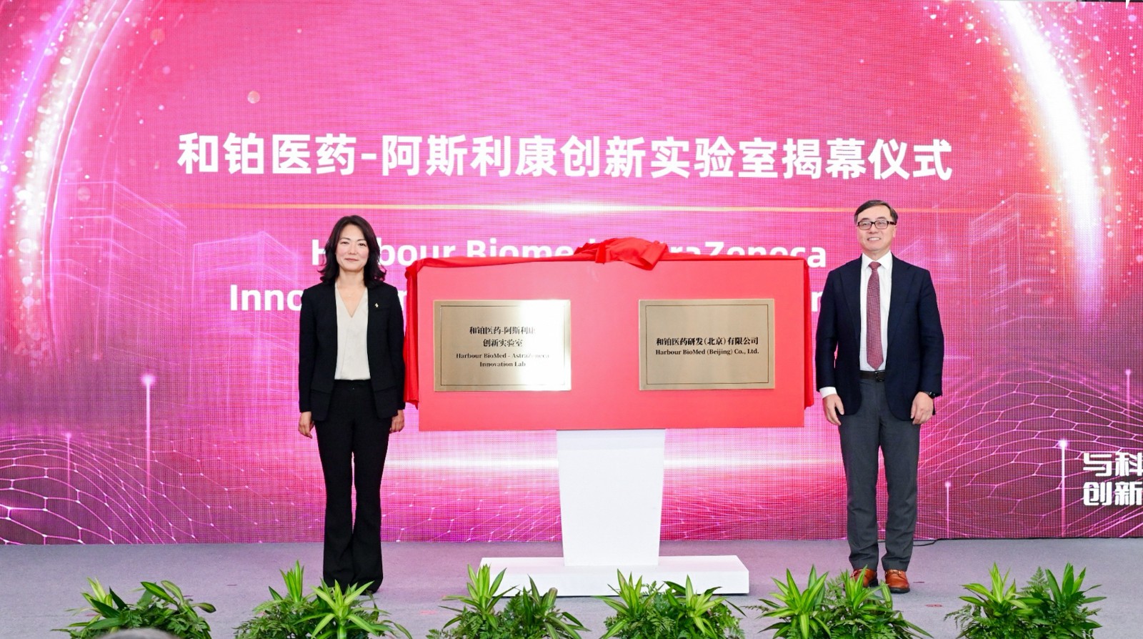 和铂医药创始人、董事长兼CEO王劲松(右)与阿斯利康全球高级副总裁,全球研发中国负责人何静(左)共同揭牌