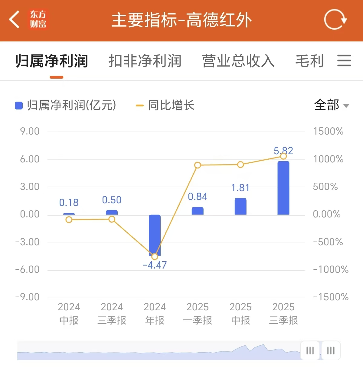 比如净利润增长暂列第一的高德红外,公司10月28日发布2025年三季报显示,前三季实现营业收入30.68亿元,同比增长69.27%;归母净利润5.82亿元,同比增长1058.95%;扣非归母净利润5.36亿元,同比增长1996.15%。