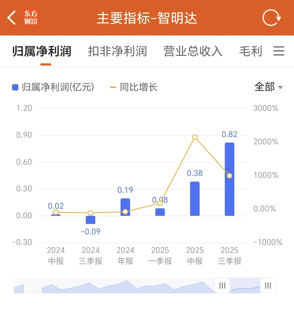 净利润增长率排名第二的智明达也是类似原因。智明达10月23日披露的2025年三季报显示,公司前三季度实现营业收入5.12亿元,同比增长145.16%;实现净利润为8198.71万元,同比扭亏为盈。其中,第三季度公司实现营业收入2.17亿元,同比增长340.71%;实现净利润4368.91万元,同比扭亏为盈。