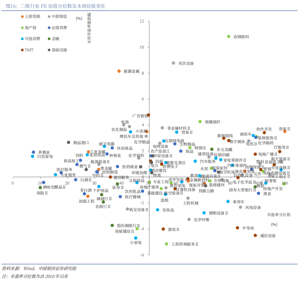 二级行业表现来看,本周收益率前五的行业依次是冶钢原料、光伏设备、能源金属、广告营销、电池;收益率靠后的行业依次是小家电、通信设备、工程咨询服务Ⅱ、游戏Ⅱ、房屋建设Ⅱ。