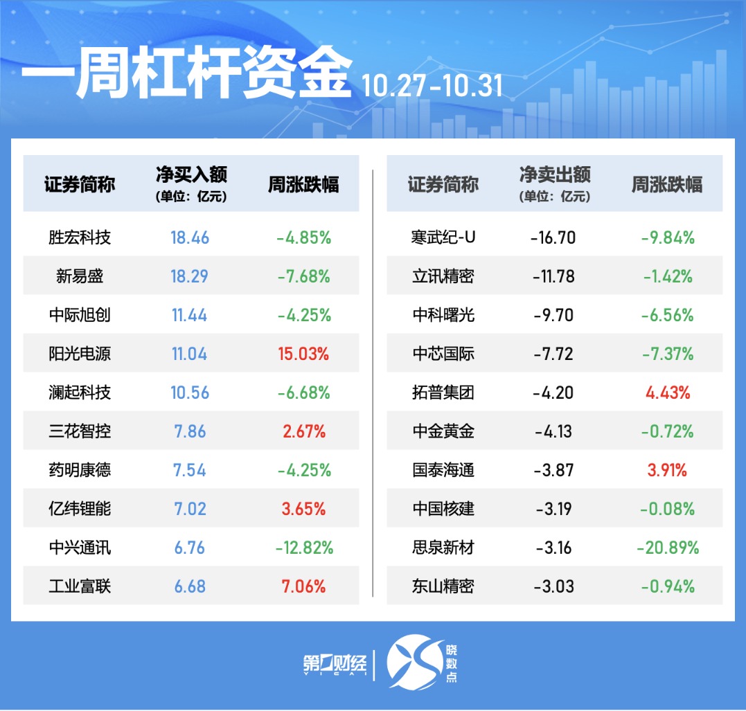 胜宏科技本周获融资净买入居首,净买入额为18.46亿元。新易盛、中际旭创、阳光电源净买入额居前,金额分别为18.29亿元、11.44亿元、11.04亿元;寒武纪-U、立讯精密、中科曙光遭净卖出额居前,金额分别为16.7亿元、11.78亿元、9.7亿元。