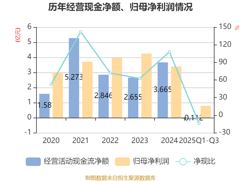 2025年前三季度,公司经营活动现金流净额为-1122.97万元,同比减少1.37亿元;筹资活动现金流净额-1.45亿元,同比增加2965.36万元;投资活动现金流净额-4.26亿元,上年同期为-6276.95万元。