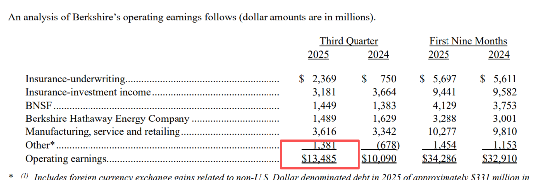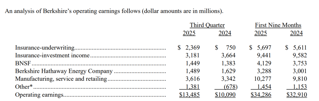 伯克希尔来自其全资业务(包括保险与铁路等)的经营利润(剔除部分投资结果)在第三季度同比跃升34%,至134.85亿美元。增长主要源于保险承保收益飙升200%以上,达到23.7亿美元。