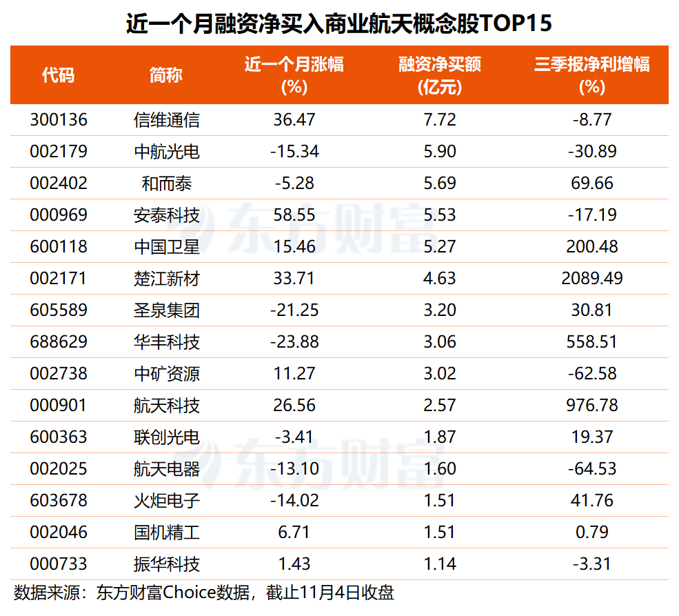 值得注意的是,多只商业航天概念股近一个月来获得杠杆资金的青睐,其中多股业绩显著增长或回暖。和而泰区间融资净买额达5.69亿元,公司前三季度净利同比增长七成;中国卫星近一个月获融资客加仓5.27亿元,公司今年前三季度实现扭亏为盈;净利同比大增的楚江新材,其融资净买额也有4.63亿元;航天科技前三季度归母净利润为9489.27万元,上年同期亏损逾1000万元,近一个月,杠杆资金对其加仓2.57亿元。