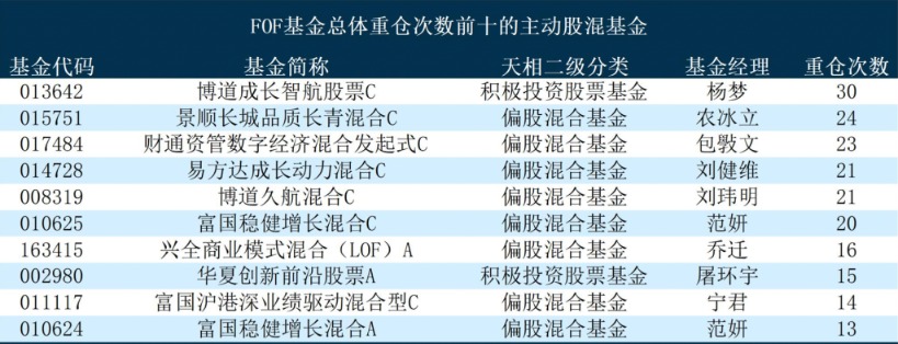 乔迁管理的兴全商业模式混合(LOF)A、屠环宇管理的华夏创新前沿股票A、宁君管理的富国沪港深业绩驱动混合型C、范妍管理的富国稳健增长混合A,被FOF基金重仓次数则均在10次以上。