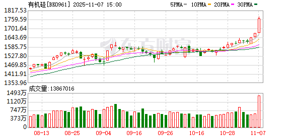 继磷11月6日拉升后,11月7日硅又成了市场新焦点。11月7日早盘,有机硅、晶体硅等题材股纷纷走强。有机硅方向的东岳硅材、瑞泰新材、合盛硅业、江苏国泰涨停;晶体硅方向的弘元绿能、亿晶光电涨停。
