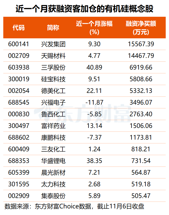 东方财富Choice数据显示,近一个月以来,共有14只有机硅概念股获融资净买入,其中5股融资净买额超5000万元,兴发集团获融资客抢筹1.56亿元,天赐材料融资净买额达1.45亿元。