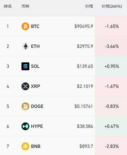 加密货币方面,多个币种下跌,比特币跌超1.5%,报90495美元/枚,过去24小时,全市场超21万人爆仓。