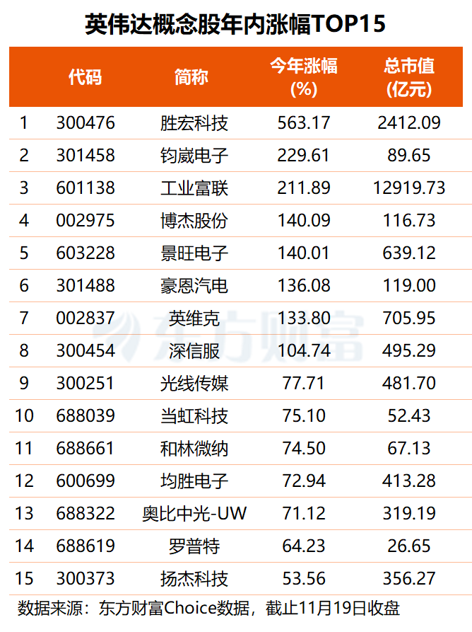 东方财富概念板块显示,目前A股市场共有54只英伟达概念股,合计总市值达2.77万亿元,其中,巨无霸工业富联遥遥领先,总市值已达1.29万亿,PCB行业龙头胜宏科技以2412亿元的总市值位居次席,浪潮信息、华勤技术、英维克、景旺电子等6股总市值均在500亿元以上。