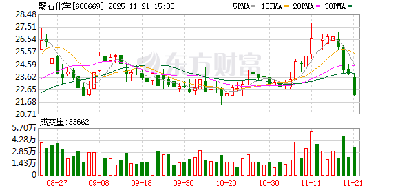 业绩数据方面,2025年前三季度,聚石化学营收为29.63亿元,同比下降7.17%;归母净利润576.84万元,扣非归母净利润为亏损2453.22万元。公司股价年内累计上涨43.85%,最新收盘价22.21元/股,市值规模近27亿元。
