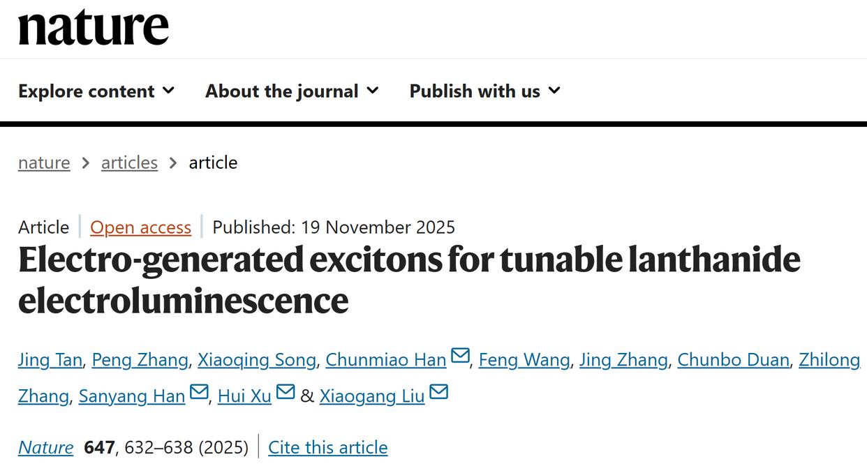 近日,黑龙江大学、清华大学和新加坡国立大学合作完成的突破性研究成果在《Nature》正式发表,成功攻克绝缘性稀土纳米晶的高效电致发光这一世界难题。该研究为实现我国稀土资源从“原料出口”向“高附加值技术输出”的战略转型提供了关键核心技术支撑。