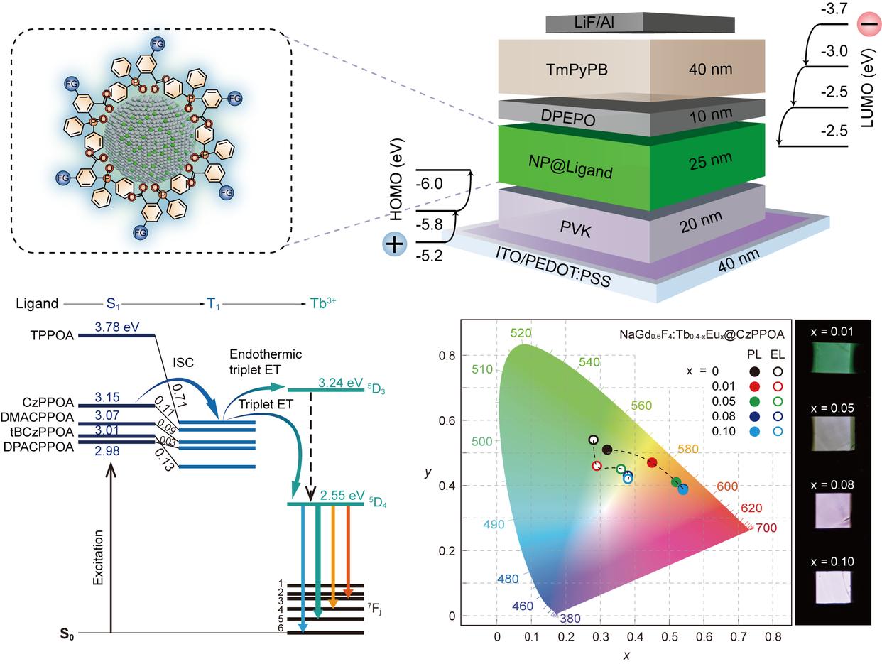 面对这一制约稀土材料迈向高端应用的瓶颈,研究团队开创性地提出有机半导体敏化策略,以功能化有机配体作为“光电桥梁”,成功将能量精准高效地传递给绝缘稀土纳米晶,实现了电流驱动下的高效发光。