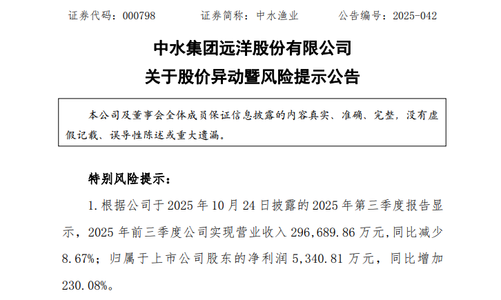 对于近期股价异动,中水渔业提示,根据公司于2025年10月24日披露的2025年第三季度报告显示,2025年前三季度公司实现营业收入29.67亿元,同比减少8.67%;归母净利润5340.81万元,同比增加230.08%。