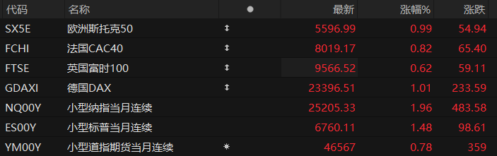 周四盘前,美股三大股指期货齐涨,欧洲主要指数普遍上涨。截至发稿,纳斯达克100指数期货涨1.96%,标普500指数期货涨1.48%,道指期货涨0.78%。