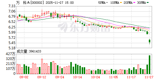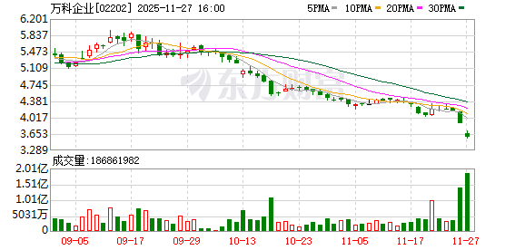 当日万科A股价一度下探至5.89元/股,创下2015年10月以来新低。而港股万科企业跌幅超过4%,自9月12日到11月26日期间,股价从5.94港元一路下跌至4港元附近,创下2024年9月以来新低。