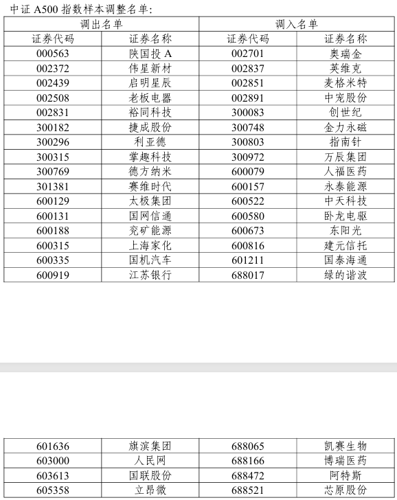 中证A500指数更换20只样本,国泰海通、芯原股份、指南针等调入指数。