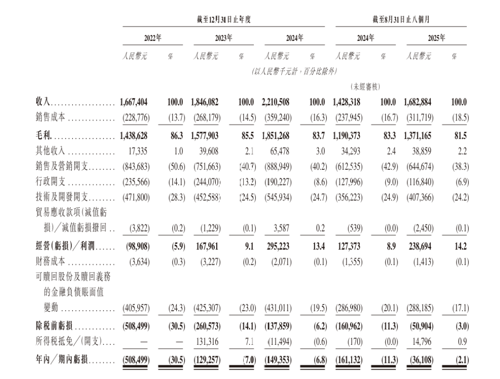 招股书披露的财务数据显示,报告期(2022年、2023年、2024年及截至2025年8月31日),销售及营销开支分别约8.43亿元、7.51亿元、8.88亿元以及6.44亿元,分别占收入的50.6%、40.7%、40.2%以及38.3%。