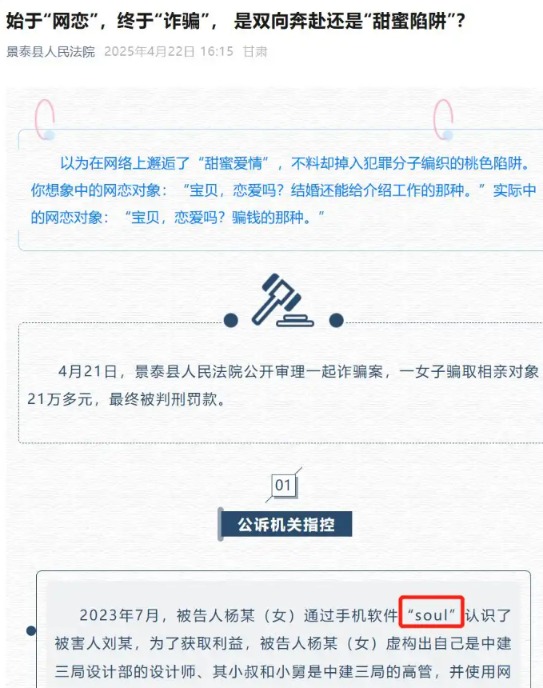 2025年4月,甘肃省景泰县人民法院审理的一起诈骗案中,被告人杨某通过Soul结识受害人,利用虚构身份骗得共计21万余元。