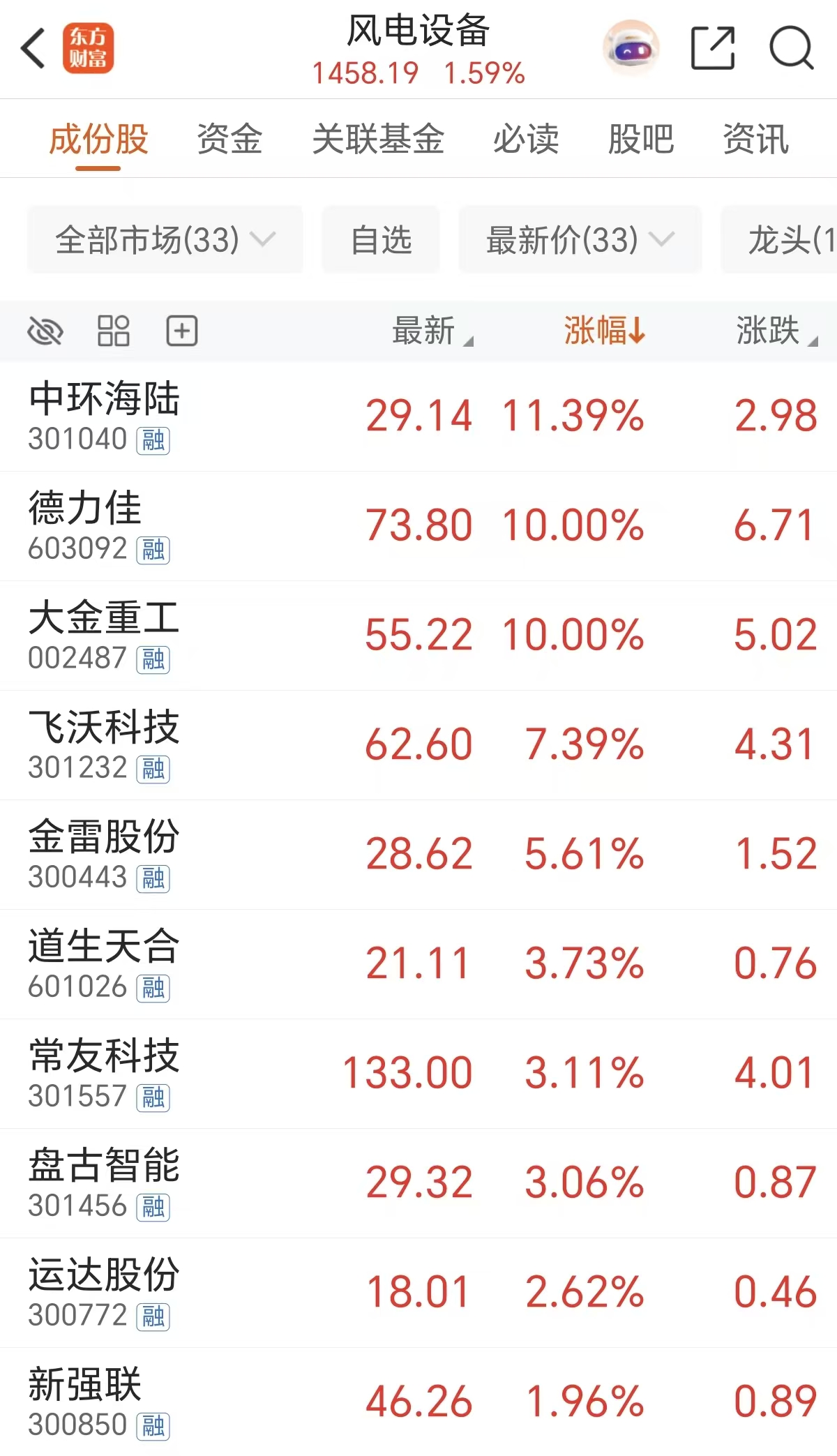 周三(12月3日)风电板块收盘逆势大涨1.6%。个股方面,中环海陆涨超11%,次新股德力佳涨停,300亿龙头大金重工午盘封上涨停,飞沃科技、金雷股份等跟涨。