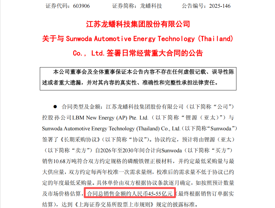 12月2日晚间,龙蟠科技发布公告称,公司控股孙公司LBM New Energy (AP) Pte.Ltd.(以下简称锂源亚太)签订《长期采购协议》,预计销售金额为45亿元至55亿元。
