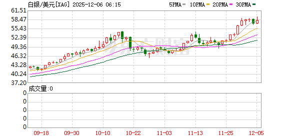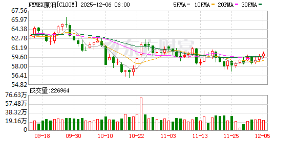 商品市场:国际油价12月05日上涨。截至当天收盘,纽约商品交易所WTI原油期货当月连续合约上涨0.47美元,收于每桶60.14美元,涨幅为0.79%。COMEX黄金期货当月连续合约下跌15.30美元,跌幅0.36%,报4227.7美元/盎司。周五纽约尾盘,现货白银涨2.08%,报58.3240美元/盎司,盘中涨至59.3336美元创历史新高,本周累涨超3%。COMEX白银期货涨2.28%,报58.8美元/盎司,盘中涨至59.900美元创盘中历史新高,本周累涨近3%。