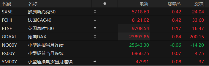 周四盘前,美股三大股指期货涨跌不一,欧洲主要指数普遍上涨。截至发稿,纳斯达克100指数期货跌0.06%,标普500指数期货涨0.07%,道指期货涨0.08%。