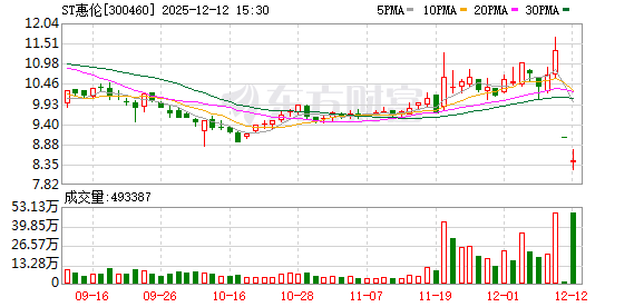 12月11日,ST惠伦(300460)复牌“一”字跌停,截至上午收盘,该股跌停板封单33.16万手。