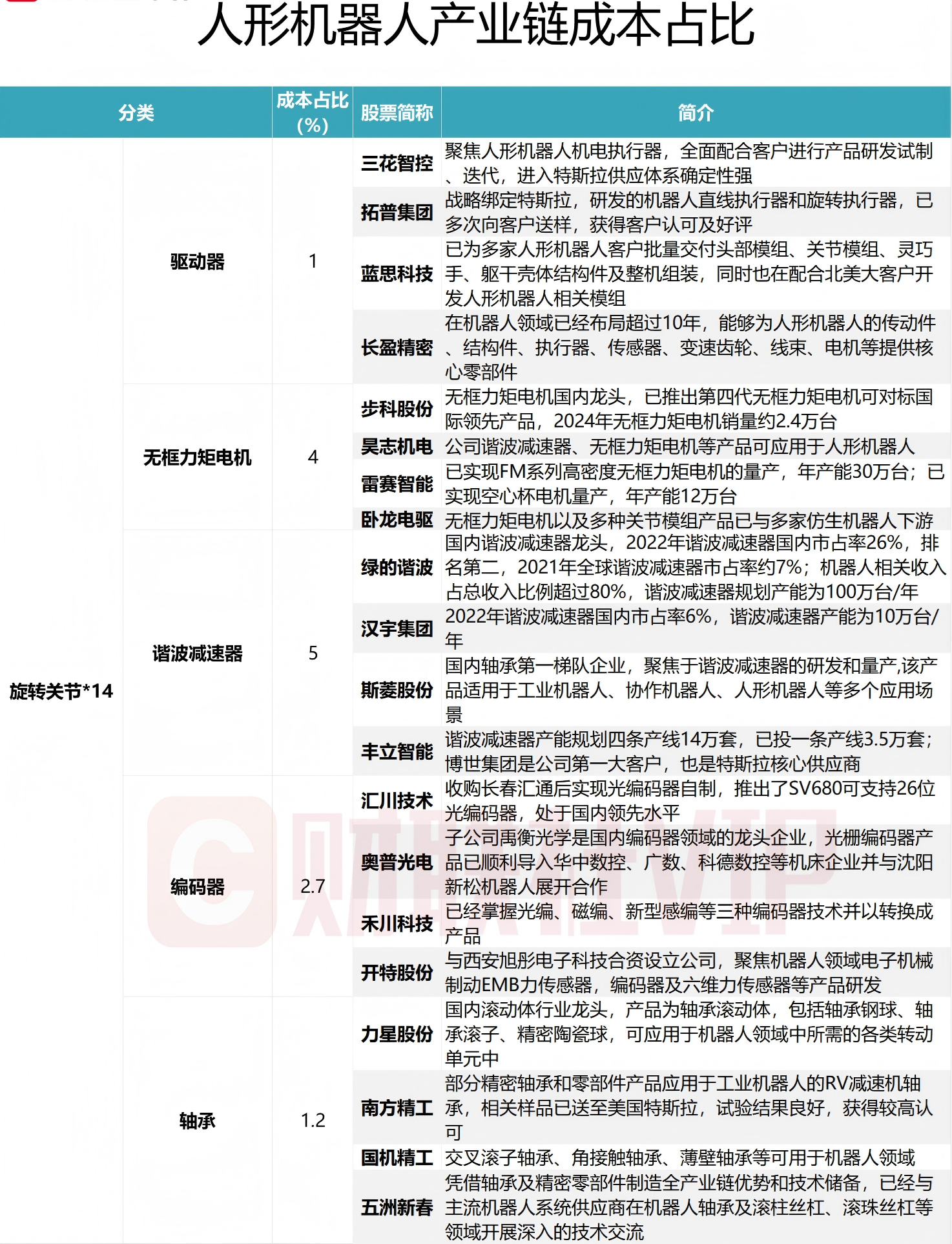 据财联社此前梳理,在人形机器人产业链中,在旋转关节领域,驱动器的成本占比为1%,涉及的A股上市公司有三花智控、拓普集团、蓝思科技和长盈精密;无框力矩电机的成本占比为4%,涉及的A股上市公司有步科股份、昊志机电、雷赛智能和卧龙电驱,谐波减速器的成本占比为5%,涉及的A股上市公司有绿的谐波、汉宇集团、斯菱股份和丰立智能,编码器的成本占比为2.7%,涉及的A股上市公司有汇川技术、奥普光电、禾川科技和开特股份,轴承的成本占比为1.2%,涉及的A股上市公司有力星股份、南方精工、国机精工和五洲新春。具体情况如下图: