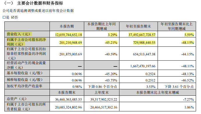 在激烈的竞争之下,近期韵达股份业绩承压,今年前三季度,公司实现营业收入374.93亿元,同比增长5.59%;归属母公司股东的净利润为7.3亿元,同比大幅下滑48.15%;扣非归母净利润6.55亿元,同比下滑44.15%。