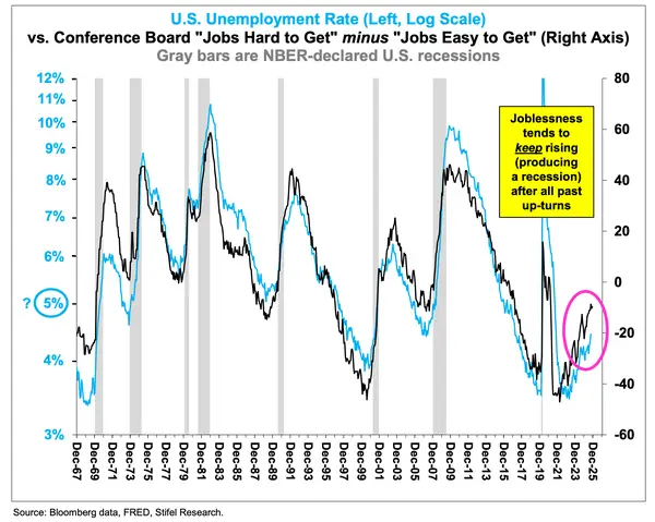 在最新报告中,他还附上了几张图表,描绘了一幅令人担忧的画面。其中一张图表突显了失业率失控上升的趋势。