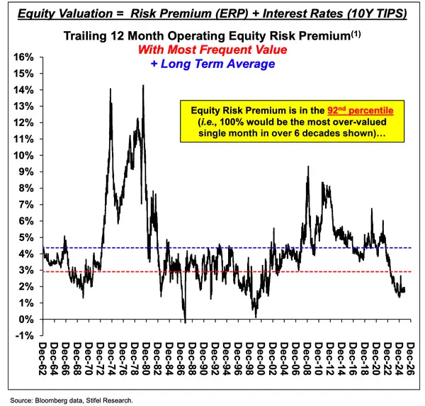 另一张图表则显示了标普500指数的股票风险溢价,即在当前估值水平下,股票预期收益高于国债收益率所代表的无风险收益的部分。该指标正接近上世纪90年代末和本世纪初互联网泡沫时期的水平。