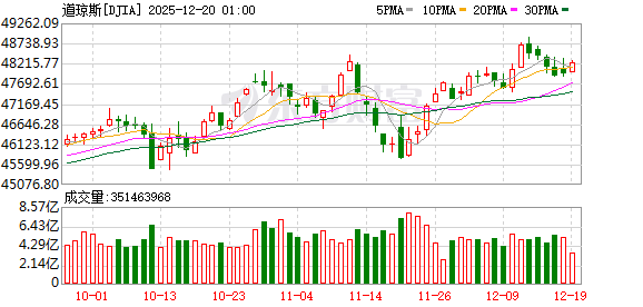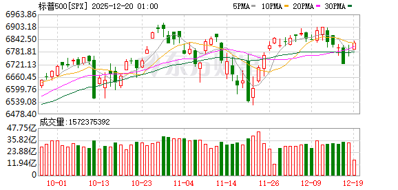 美股市场:美股三大指数12月18日收盘全线上涨。截至收盘,道琼斯工业平均指数比前一交易日上涨65.88点,收于47951.85点,涨幅为0.14%;标准普尔500种股票指数上涨53.33点,收于6774.76点,涨幅为0.79%;纳斯达克综合指数上涨313.04点,收于23006.36点,涨幅为1.38%。