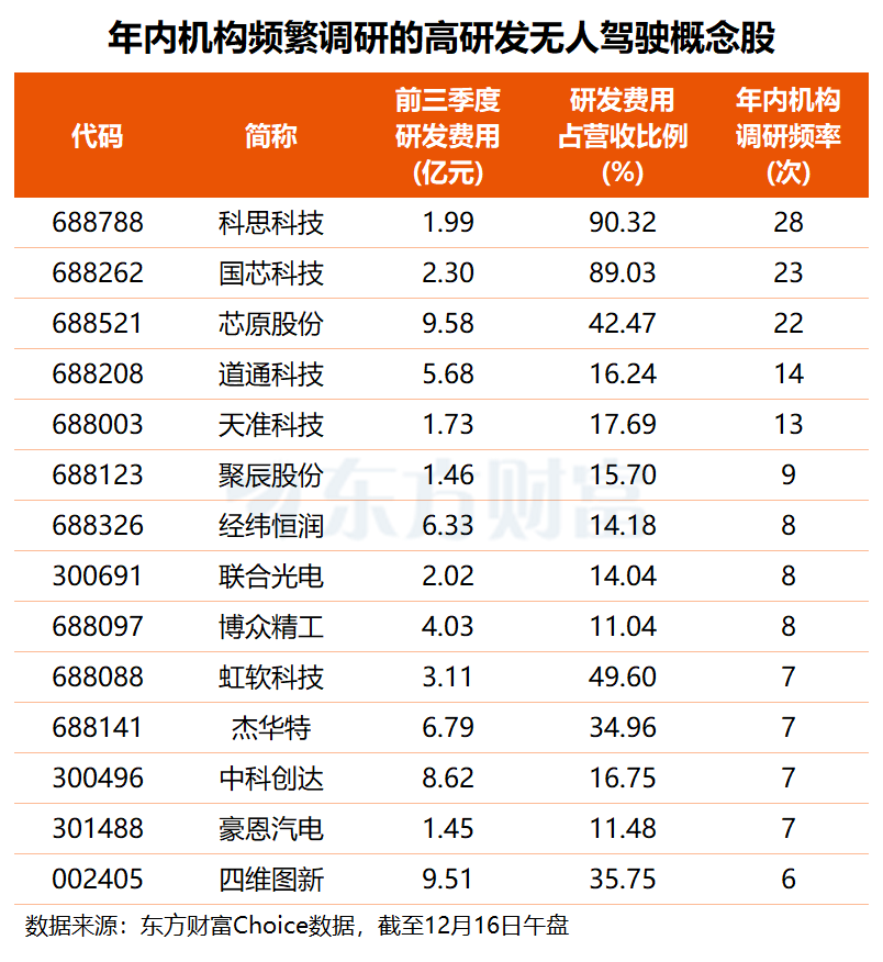 在上述43只高研发强度的无人驾驶概念股中,有14股今年以来获得5次以上机构调研,其中,科思科技年内接待机构调研频率达28次,国芯科技、芯原股份也分别有23次、22次机构前往调研,道通科技、天准科技机构调研次数均超10次。