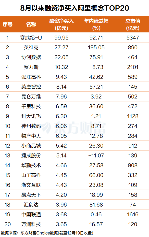 东方财富Choice数据显示,自今年8月以来,杠杆资金抢筹了一批阿里概念股,融资净买入前20个股合计金额近250亿元。