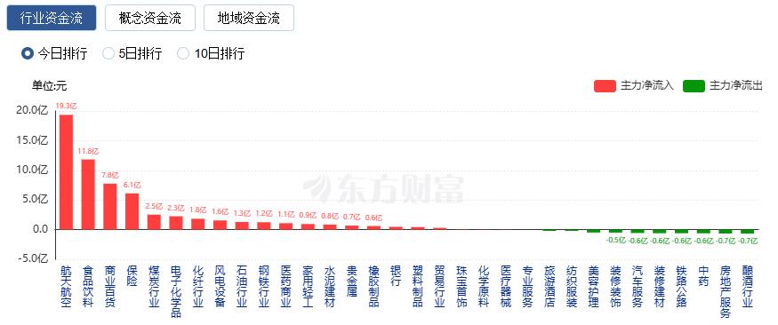 行业资金方面,截至收盘,航天航空、食品饮料、商业百货等净流入排名靠前,其中航天航空净流入19.35亿。