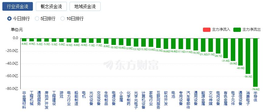 净流出方面,半导体、消费电子、通信设备等净流出排名靠前,其中半导体净流出76.57亿元。