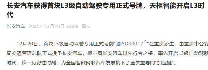 据长安汽车,12月20日,首块L3级自动驾驶专用正式号牌“渝AD0001Z”在重庆诞生,由重庆市公安局交通管理总队正式授予长安汽车,标志着长安汽车率先开启L3级自动驾驶时代。