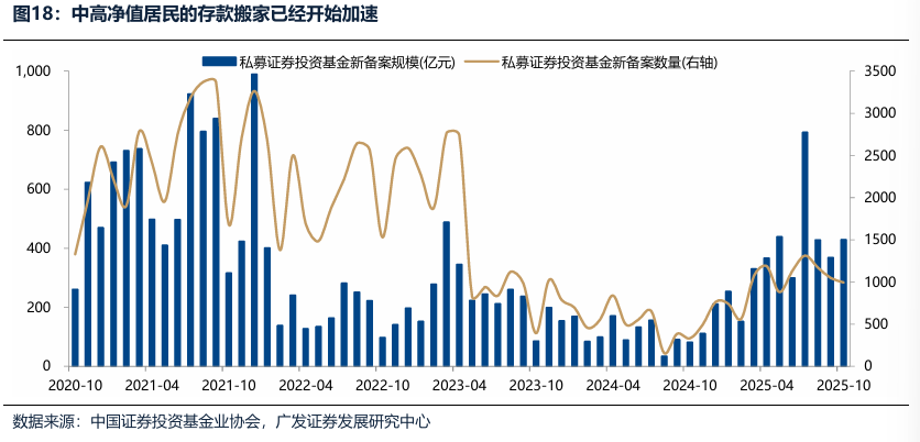 相比于低净值居民,中高净值居民的存款搬家更具确定性。事实上,中高净值居民的存款搬家已经开始加速——从私募证券投资基金备案情况看,2025年1-10月已经新备案3860亿元,单月备案规模接近2021年的水平。