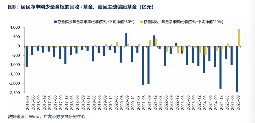 (4)居民净申购少量含权、净赎回主动偏股——固收+净申购创2016年以来新高,而主动偏股基金净赎回同样创2016年以来新高;