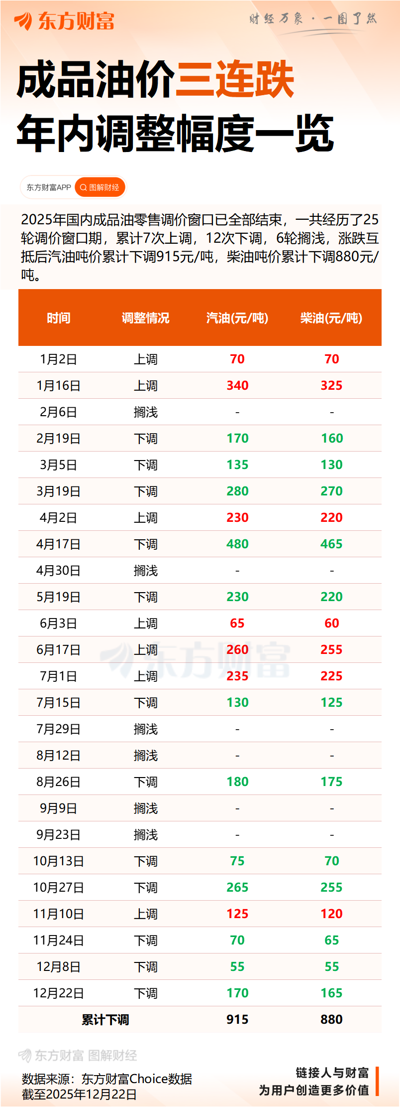 至此,2025年国内成品油零售调价窗口已全部结束,一共经历了25轮调价窗口期,其中累计7次上调,12次下调,6轮搁浅,涨跌互抵后汽油吨价累计下调915元/吨,柴油吨价累计下调880元/吨。