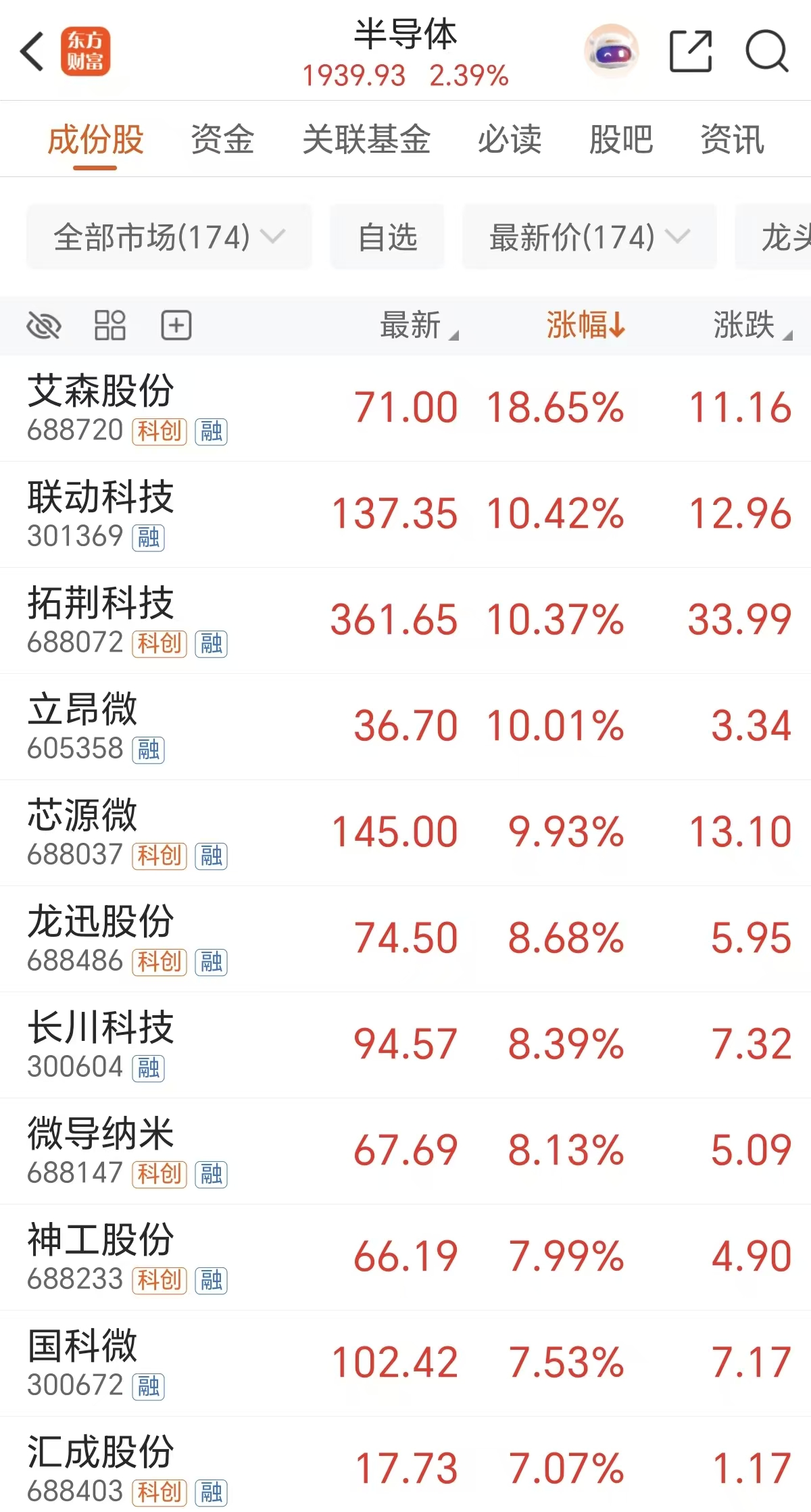 周一(12月22日)半导体板块大爆发,个股方面,艾森股份涨近19%,联动科技、拓荆科技涨超10%,立昂微等个股涨停。