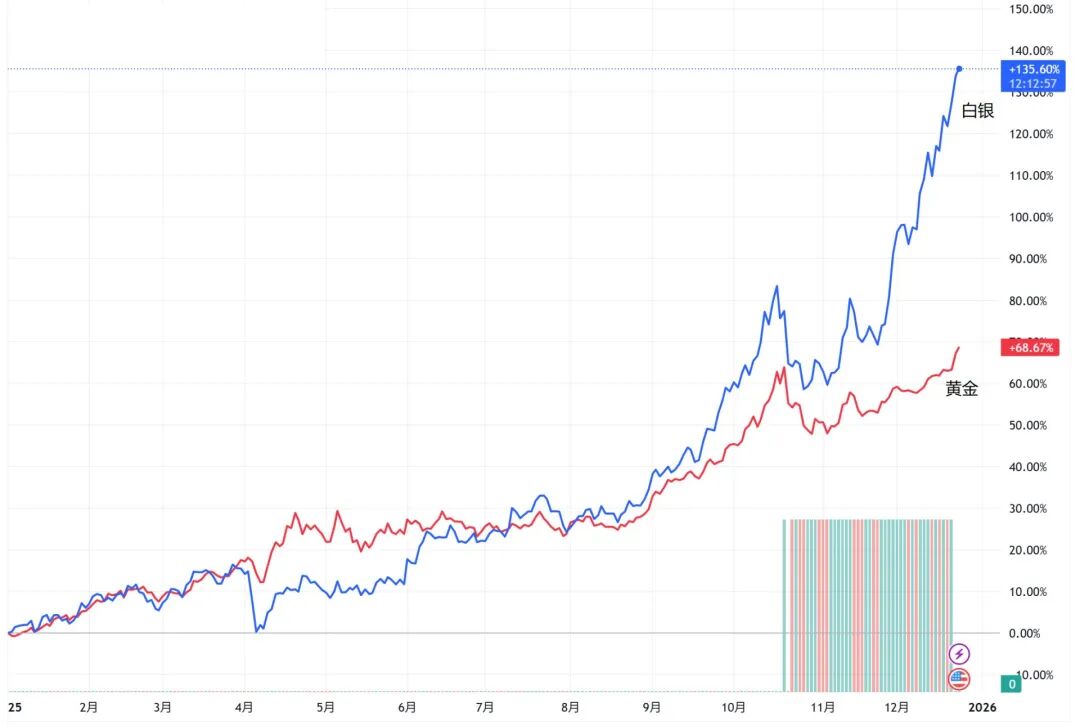 回顾全年,贵金属无疑是资产配置中最耀眼的明星。截至12月23日,现货黄金年内累计涨70.89%,而现货白银的涨势更为惊人,年内累计上涨140.77%。