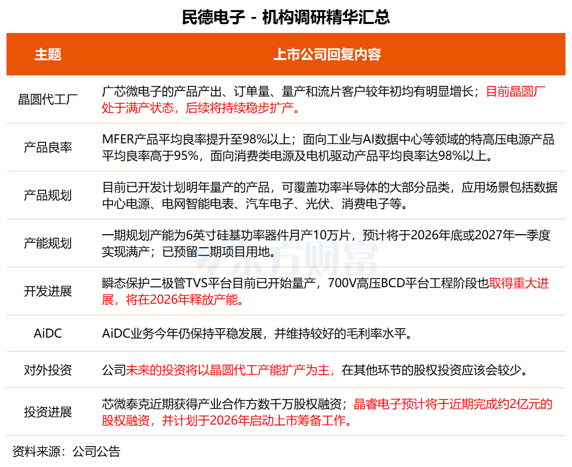关于未来的产能规划,民德电子表示,广芯微电子一期规划产能为6英寸硅基功率器件月产10万片,预计将于2026年底或2027年一季度实现满产,同时已预留二期项目用地。