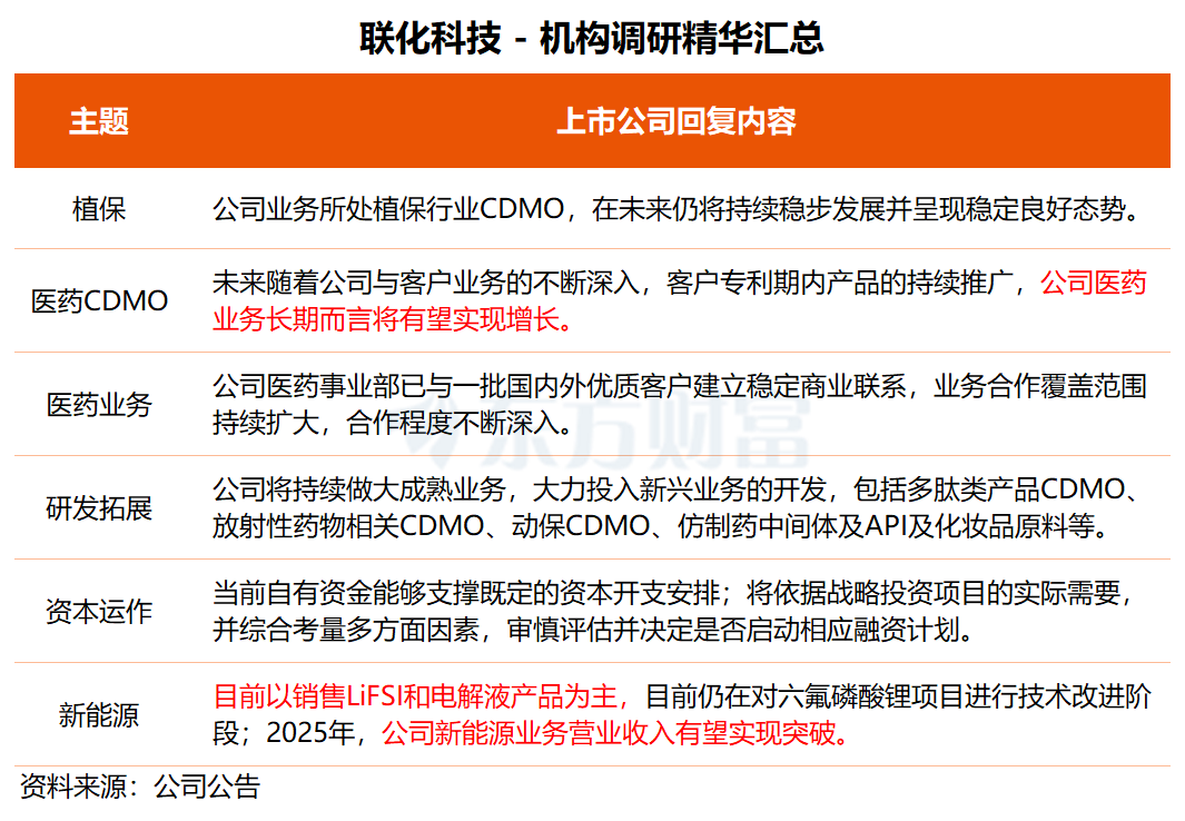 新能源业务方面,联化科技透露,公司目前以销售LiFSI(双氟磺酰亚胺锂)和电解液产品为主,目前仍在对六氟磷酸锂项目进行技术改进阶段。“2025年,公司新能源业务营业收入有望实现突破。后续将继续以个别核心产品深入新能源市场,打通供应链上下游,把技术积累的优势转化为市场优势。”