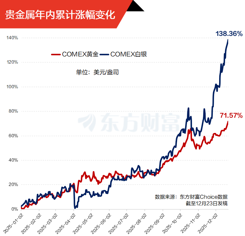 这是今年以来金价第50次打破纪录。交易员们押注美联储明年将再次降低借贷成本,以及近期地缘政治局势,尤其是委内瑞拉局势紧张加剧,令黄金的避险吸引力进一步增强。今年以来,COMEX黄金累计涨幅已超71%,同期COMEX白银累计涨幅超138%。
