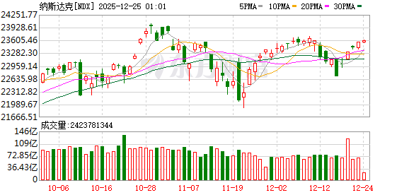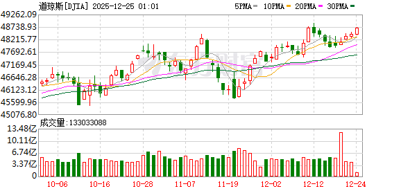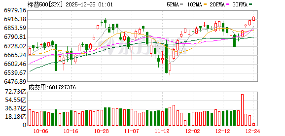 美股市场:美股三大指数12月22日收盘全线上涨。截至收盘,道琼斯工业平均指数比前一交易日上涨227.79点,收于48362.68点,涨幅为0.47%;标准普尔500种股票指数上涨43.99点,收于6878.49点,涨幅为0.64%;纳斯达克综合指数上涨121.21点,收于23428.83点,涨幅为0.52%。