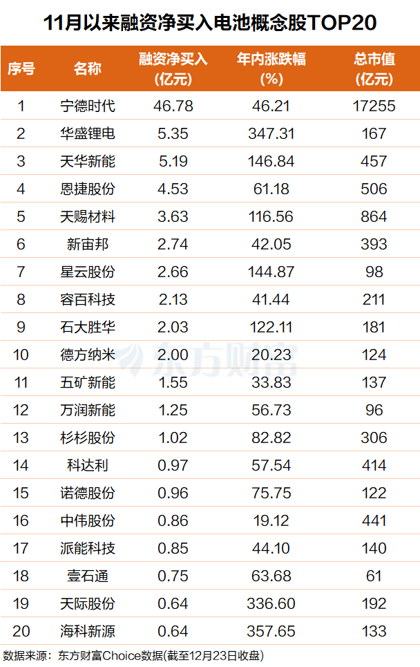 其中宁德时代排名第一,融资净买入超46亿元;华盛锂电排名第二,融资净买入5.4亿元。