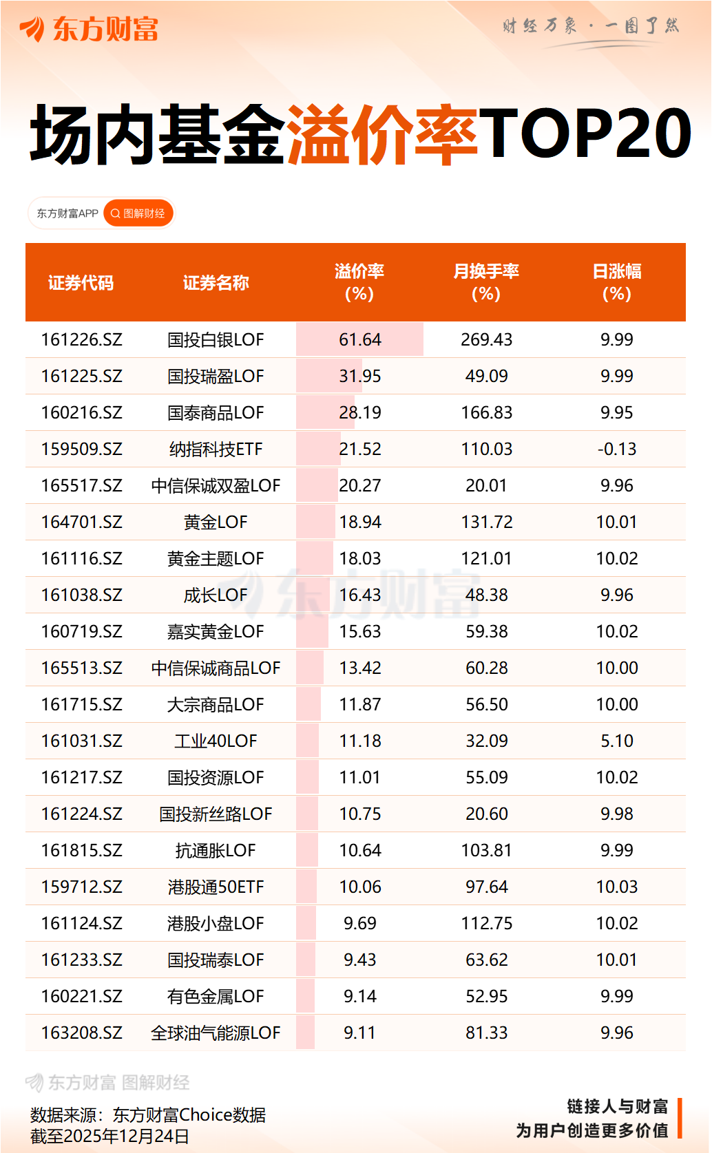 12月24日,国投白银LOF连续三天涨停,最新溢价近70%。与此同时,多达20余只场内LOF因溢价出现涨停。