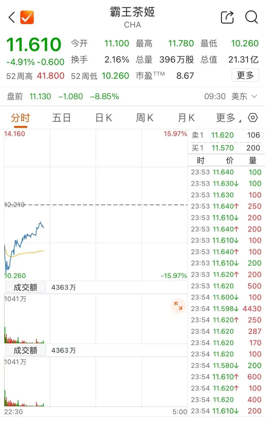 北京时间12月26日晚间美股开盘后,霸王茶姬美股大跌,盘中一度跌超14%,股价创上市以来新低。截至发稿,跌幅有所收窄。