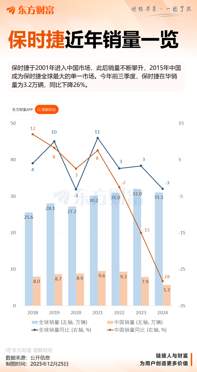 进入2024年,保时捷在华销量颓势进一步加剧,全年交付量同比大幅下滑28%至5.69万辆,全球市场份额同步收缩至15%,排名跌至全球第三。截至2025年前三季度,态势仍在延续,保时捷在华销量同比再降26%,仅为3.2万辆。